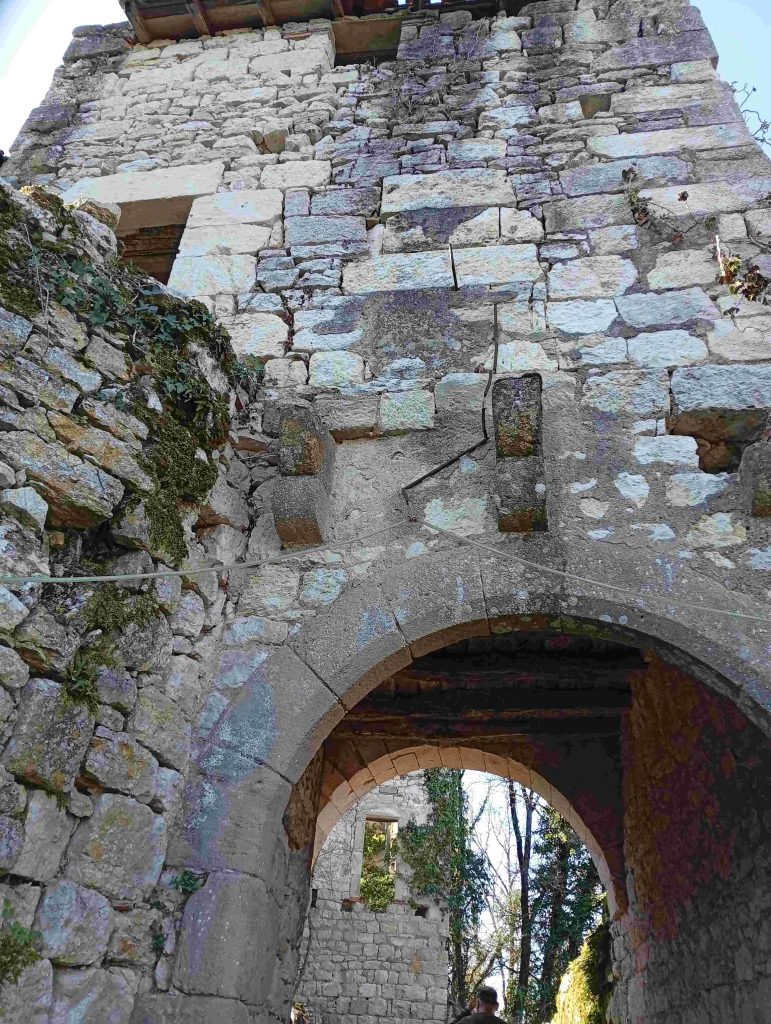 Le porche d’entrée est surmonté d’une pièce de vie ou de garde, et se prolonge sur le côté gauche. Aucun reste de cheminée n’est visible, c’est curieux.