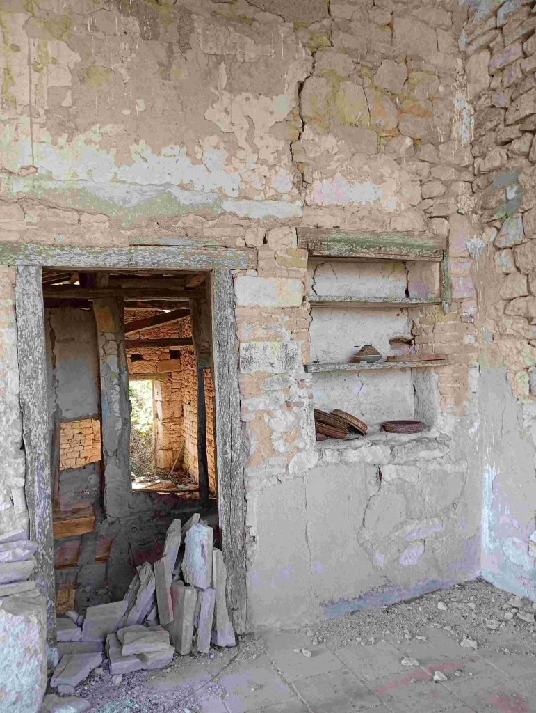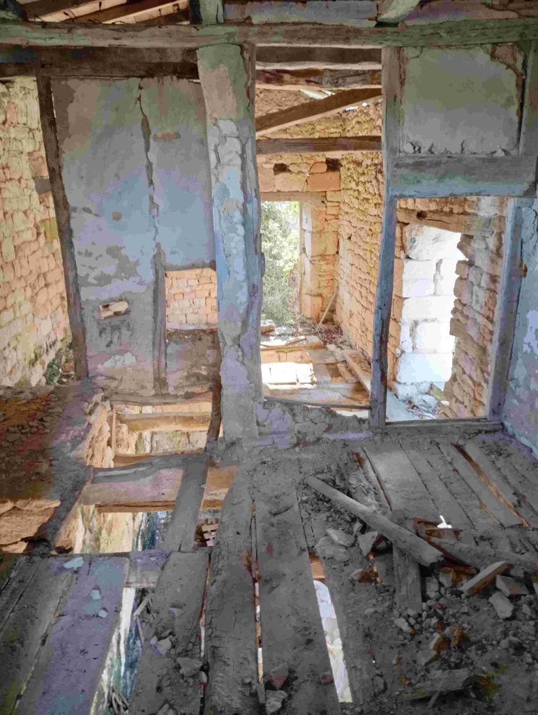 Nous avons cherché en vain, mais nous n’avons rien vu, les linteaux de cheminées et de la porte étant sûrement sous les gravas ou volés ou revendus ?