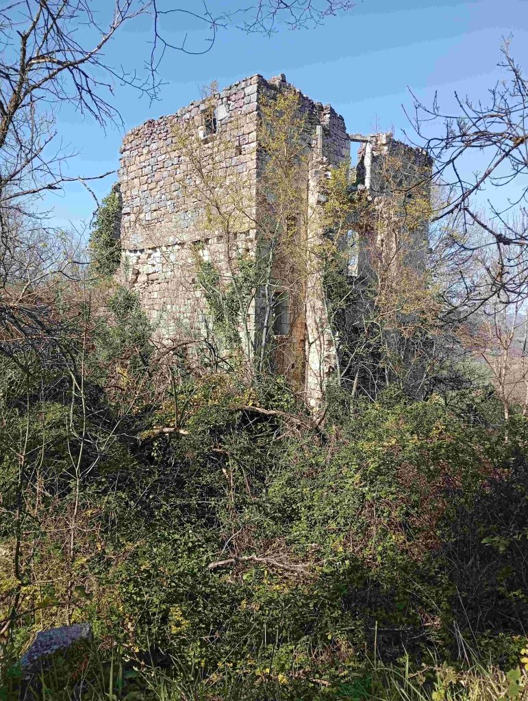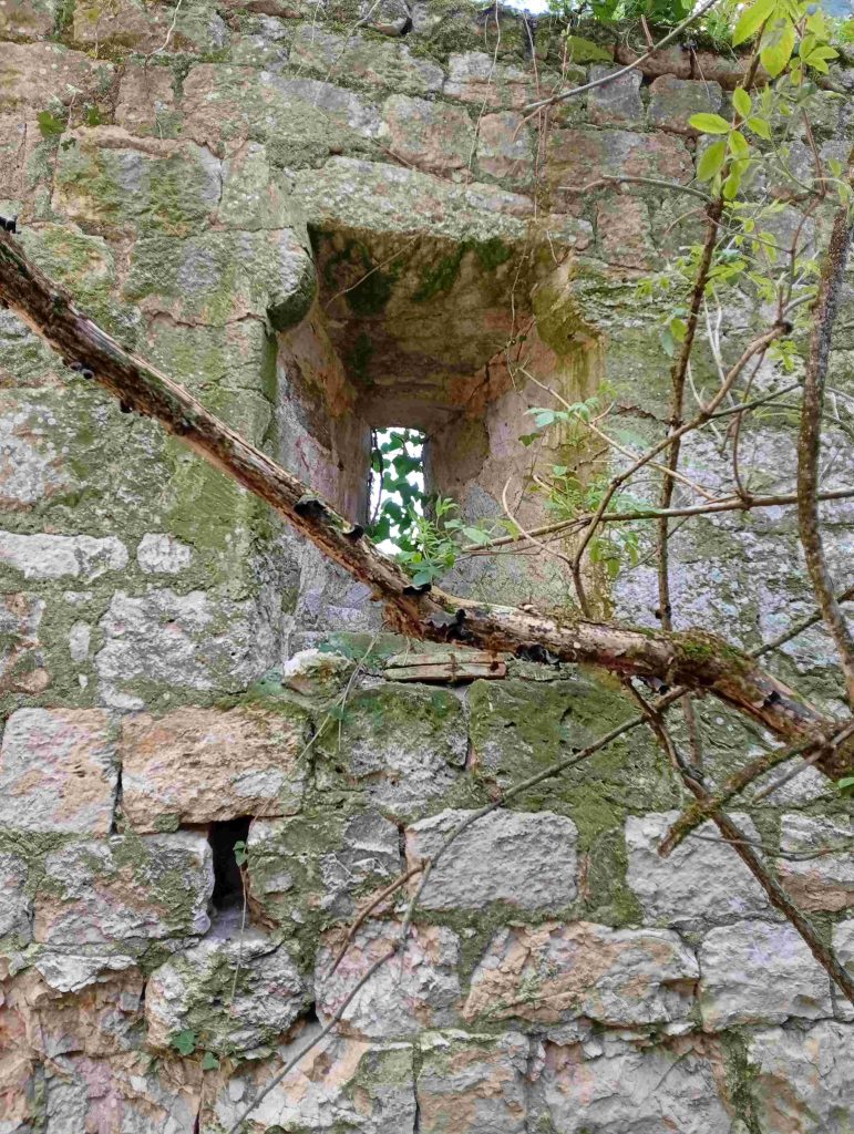 L’arrière (Nord Ouest) est très difficile d’accès à cause de la végétation épineuse, mais nous sommes vaillamment montés jusqu’en haut : Juste une petite porte et une belle fenêtre qui semble donner sur une ancienne terrasse surélevée et supportée par un très beau mur de soutènement.
