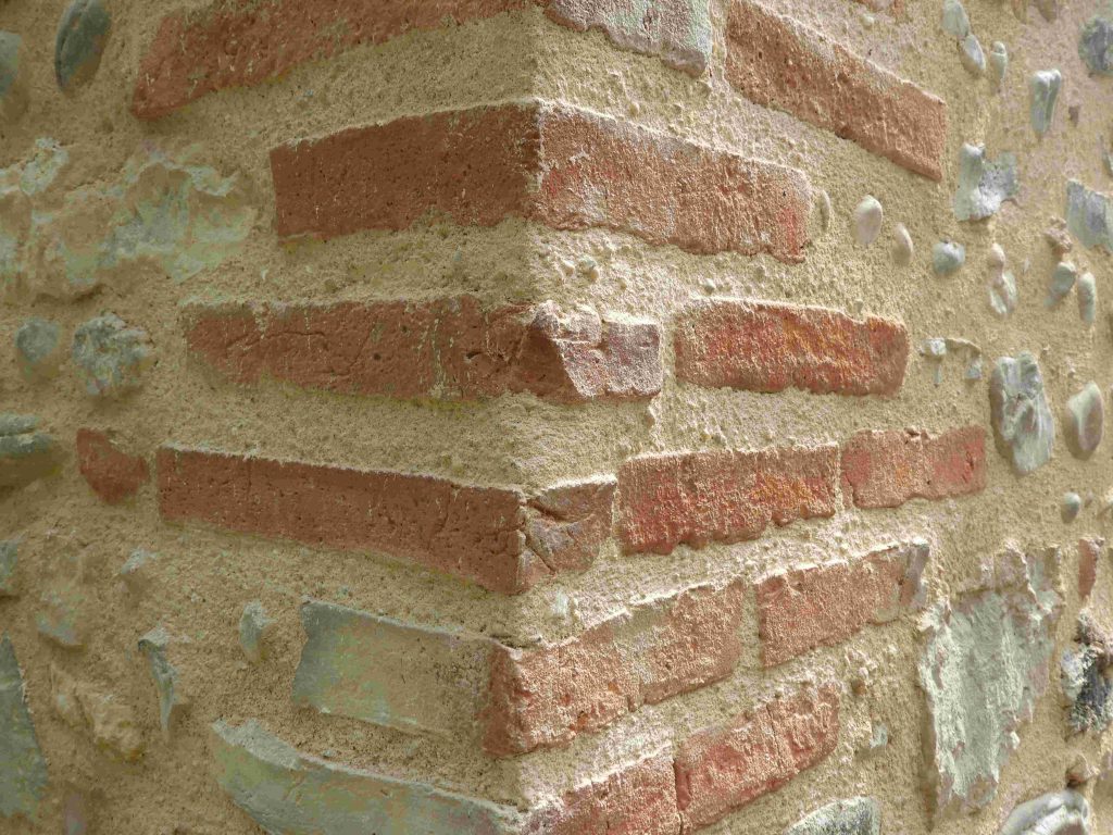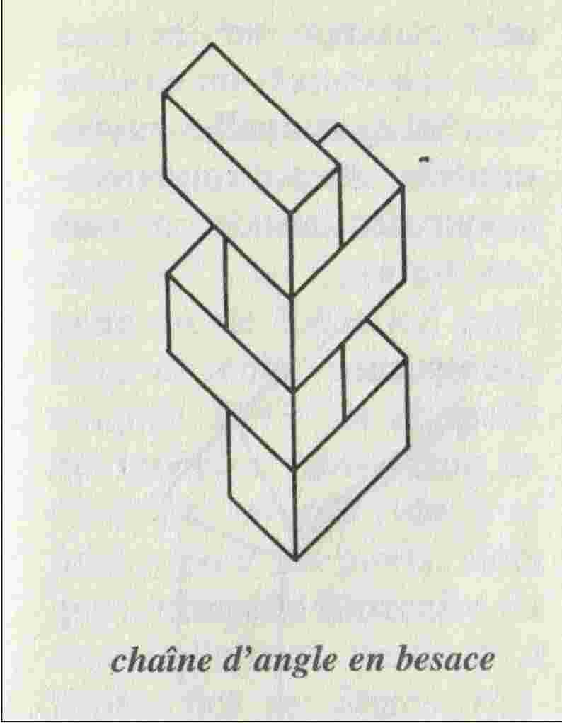 Les chaînes d’angles sont constituées de briques disposées en besace pour assurer une bonne liaison à l’angle des deux murs.