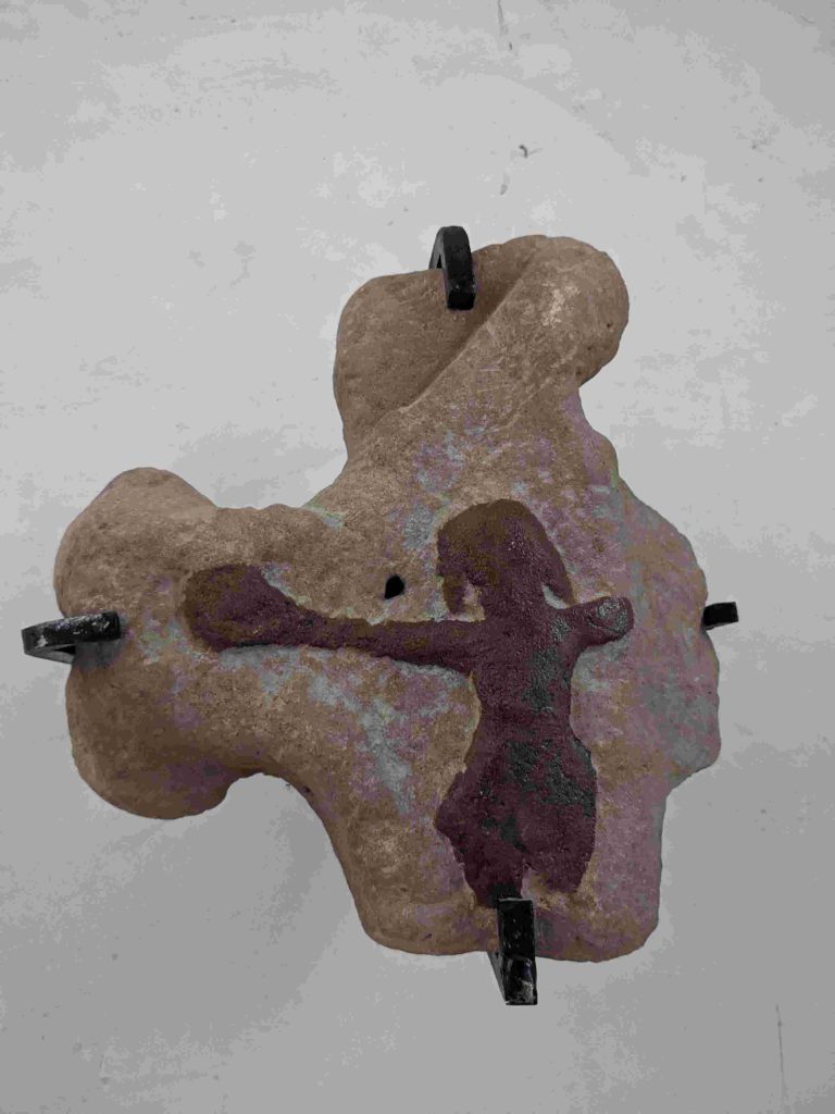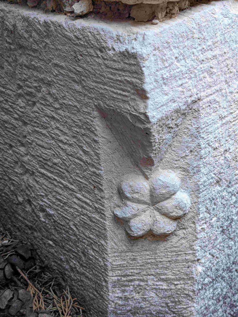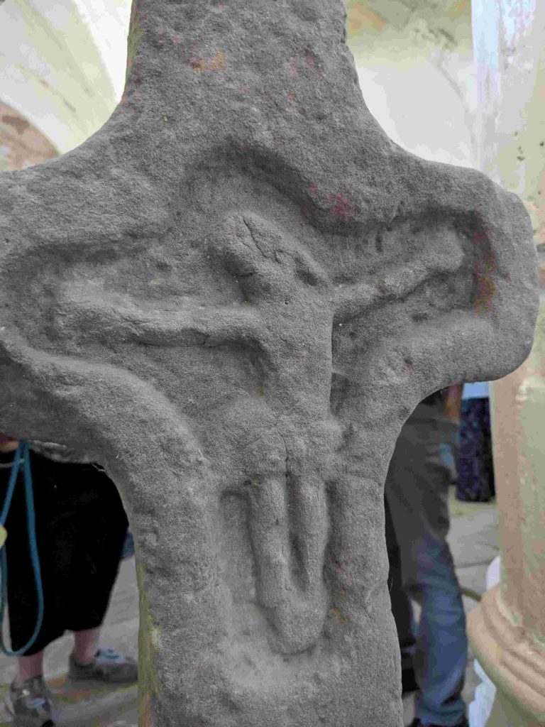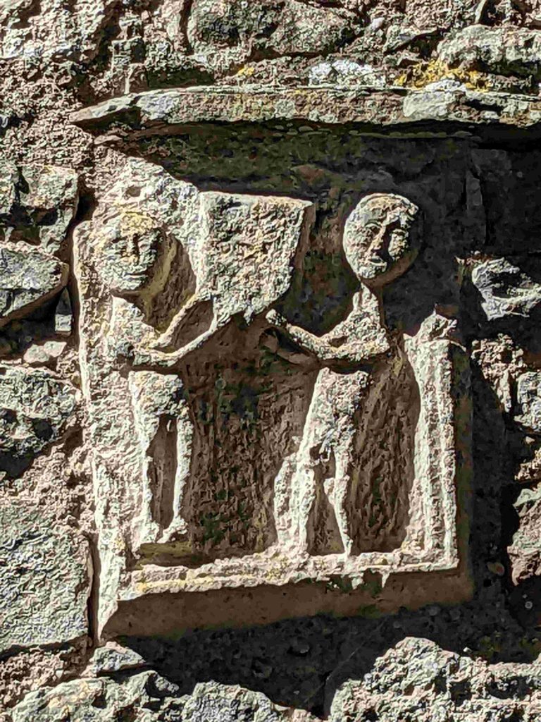 Sur le mur Sud à l’extérieur de l’église, jouxtant le cimetière, on peut admirer un bas-relief de réemploi (ou remploi) avec deux personnages masculins représentés dans leur plus simple appareil (pourquoi ?) qui regardent vers l’observateur et portent fièrement un objet volumineux en forme de trapèze renversé sur lequel les hypothèses sont ouvertes (grande coupe de libations ? Autre ?).
